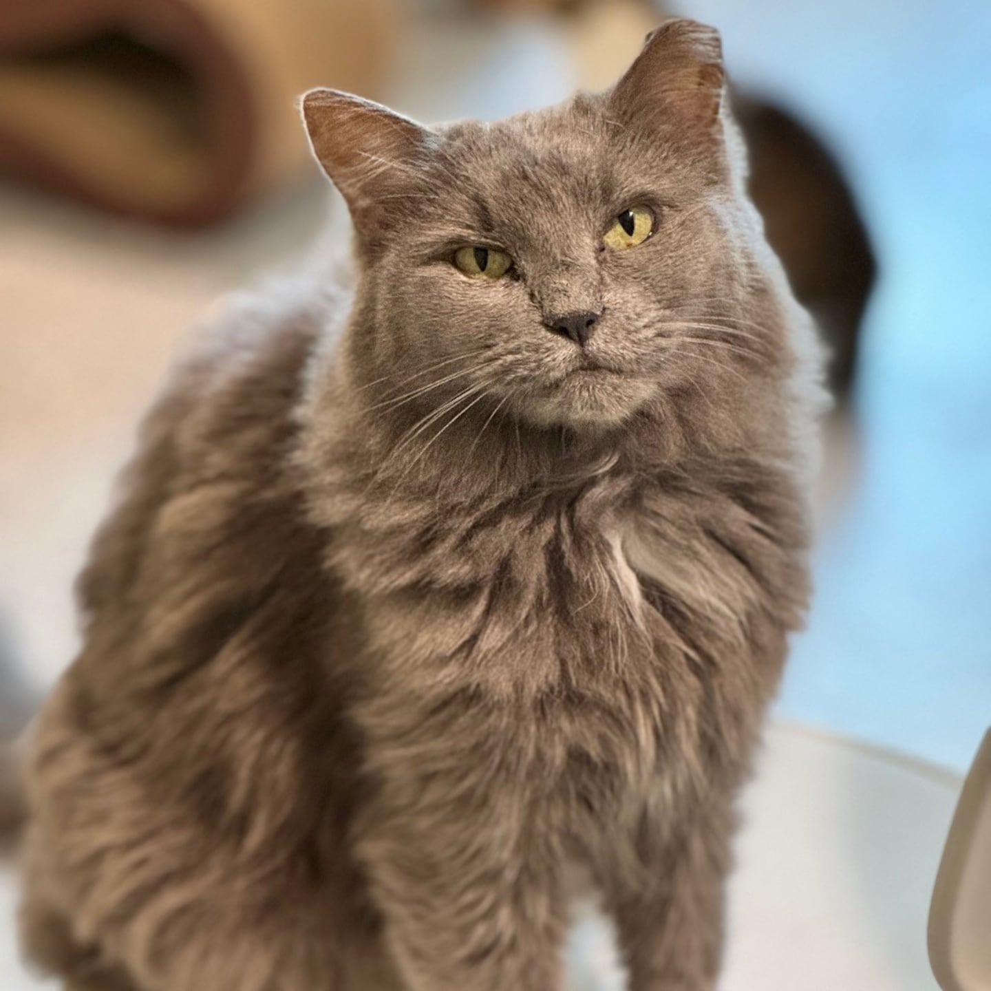 These bestie beauties are calm and mature eight-year-olds who spent most of their lives together outside. But now they’re safely in shelter and our dedicated Furkids volunteers work with them every day to gain their trust. Handsome Clyde is doing great and once he gets to know you (it doesn’t take long!) he will happily greet you with a ‘meow’ and gladly chow down on his favorite chicken treat, if you happen to be packin’ one that day. Gorgeous Bonnie, (she’s such a looker that it almost seems illegal…) loves when a newcomer enters the room and she’ll strut right up to you, tail up in the air, and enjoys a stroking of her long, luxurious grey fur.